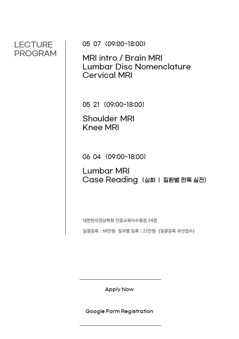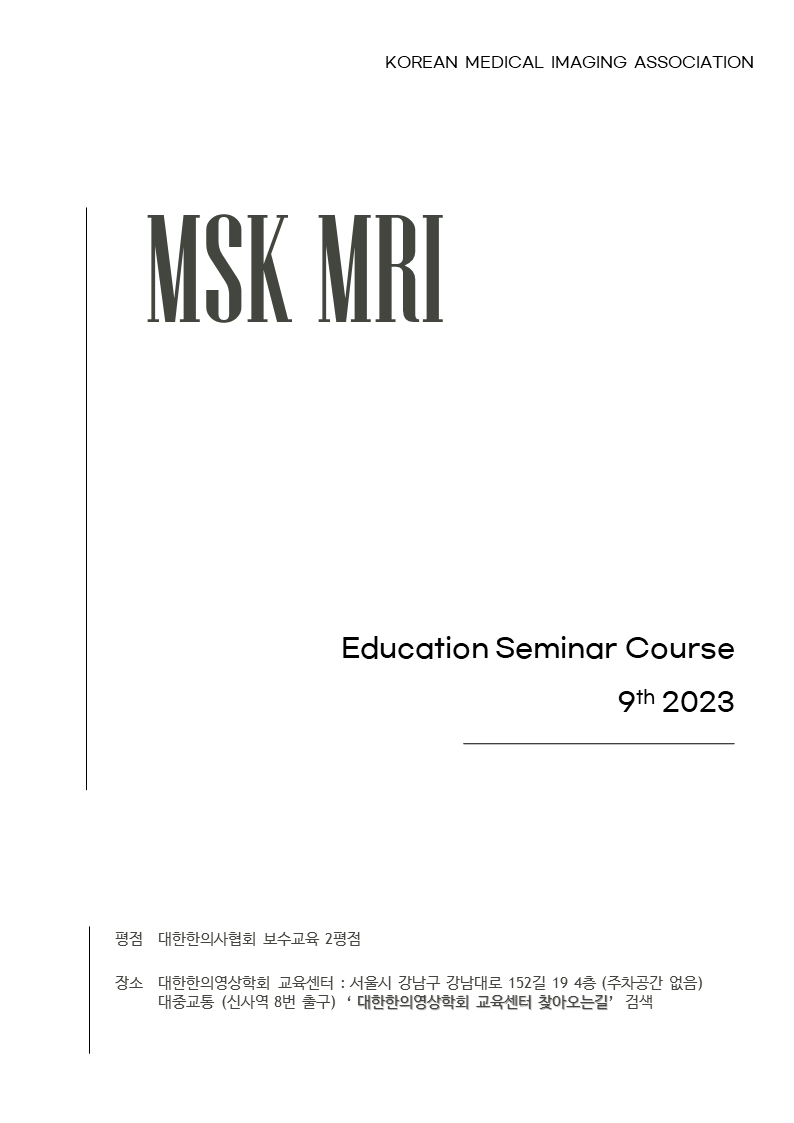 Education Seminar/MRI MSK MRI Education Seminar Course 2023 9th by Pharmacopuncture Research Lab 2023. 4. 12. 공유하기 게시글 관리 Acupuncture Radiology 저작자표시 비영리 변경금지 (새창열림) 관련글 [12.07.전주.우석한방병원] 무릎 MRI & 약침임상 Lumbar Disc Nomenclature [09.07. 우석대한의학관(한방병원 옆)] Clinical Application of Spine MRI [2023.06.02] MSK MRI 등록안내