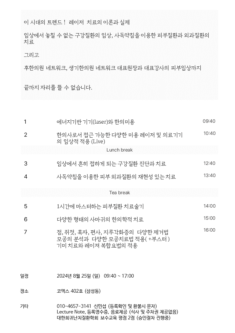Conference/Academy The 피부.미용.외과 Academy [ COEX ] by Pharmacopuncture Research Lab 2024. 7. 26. 공유하기 게시글 관리 Acupuncture Radiology 관련글 [부산] 말초신경 전문가과정 2026 말초신경 전문가과정 2026 [서울권, 마감] The Knee Academy 2019 한의 영상진단 여름캠프 (전국 한의과대학 본3,4학년)