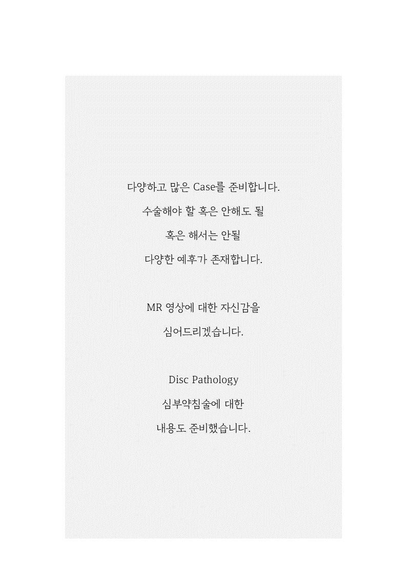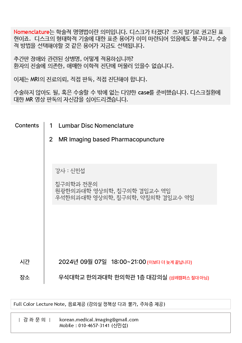 Education Seminar/MRI Lumbar Disc Nomenclature [09.07. 우석대한의학관(한방병원 옆)] by Pharmacopuncture Research Lab 2024. 8. 8. Spine MRI는 보수교육 평점을 준비하지 못했습니다. 이후 진행될 어깨, 무릎 part는 보수교육 평점 부여됩니다. 공유하기 게시글 관리 Acupuncture Radiology 관련글 [2025.02.08] Shoulder MRI, Pharmacopuncture [12.07.전주.우석한방병원] 무릎 MRI & 약침임상 MSK MRI Education Seminar Course 2023 9th Clinical Application of Spine MRI [2023.06.02]