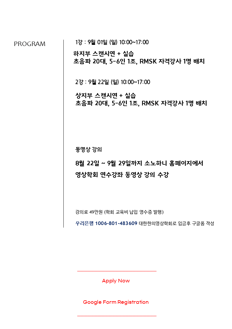 Education Seminar/Ultrasonography MSK US Education Seminar Vol.10 by Pharmacopuncture Research Lab 2024. 8. 8. 공유하기 게시글 관리 Acupuncture Radiology 관련글 Abdominal US Education Seminar Vol.09 2024 MSK Ultrasonography Study and Training Course / 2020 제7기 MSK Ultrasonography Study and Training Course / 2020 제6기 2019 대한한의영상학회 제5기 근골격계 초음파 임상연수강좌