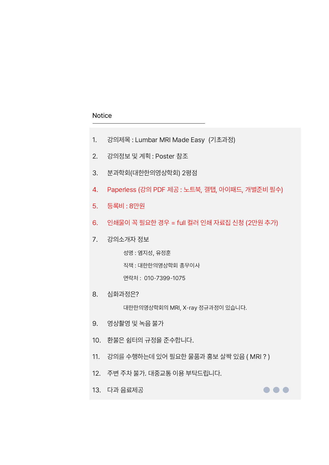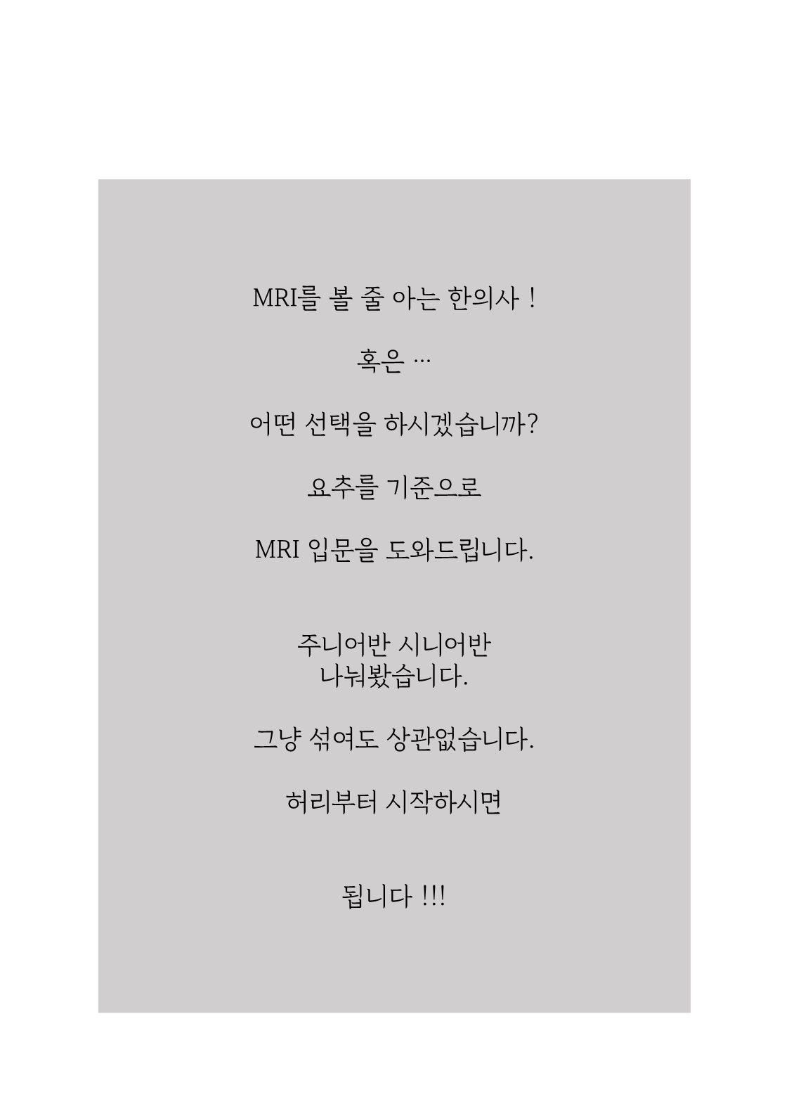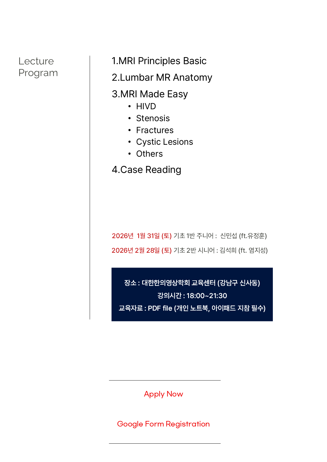 Education Seminar/MRI MRI Basic ; Lumbar MRI Made Easy [1, 31 / 2, 28] by Pharmacopuncture Research Lab 2025. 12. 26. 공유하기 게시글 관리 Acupuncture Radiology 관련글 Characteristic MRI Findings Every Clinician Should Know, 2026 Spring KAMMS [2025.02.08] Shoulder MRI, Pharmacopuncture [12.07.전주.우석한방병원] 무릎 MRI & 약침임상 Lumbar Disc Nomenclature [09.07. 우석대한의학관(한방병원 옆)]