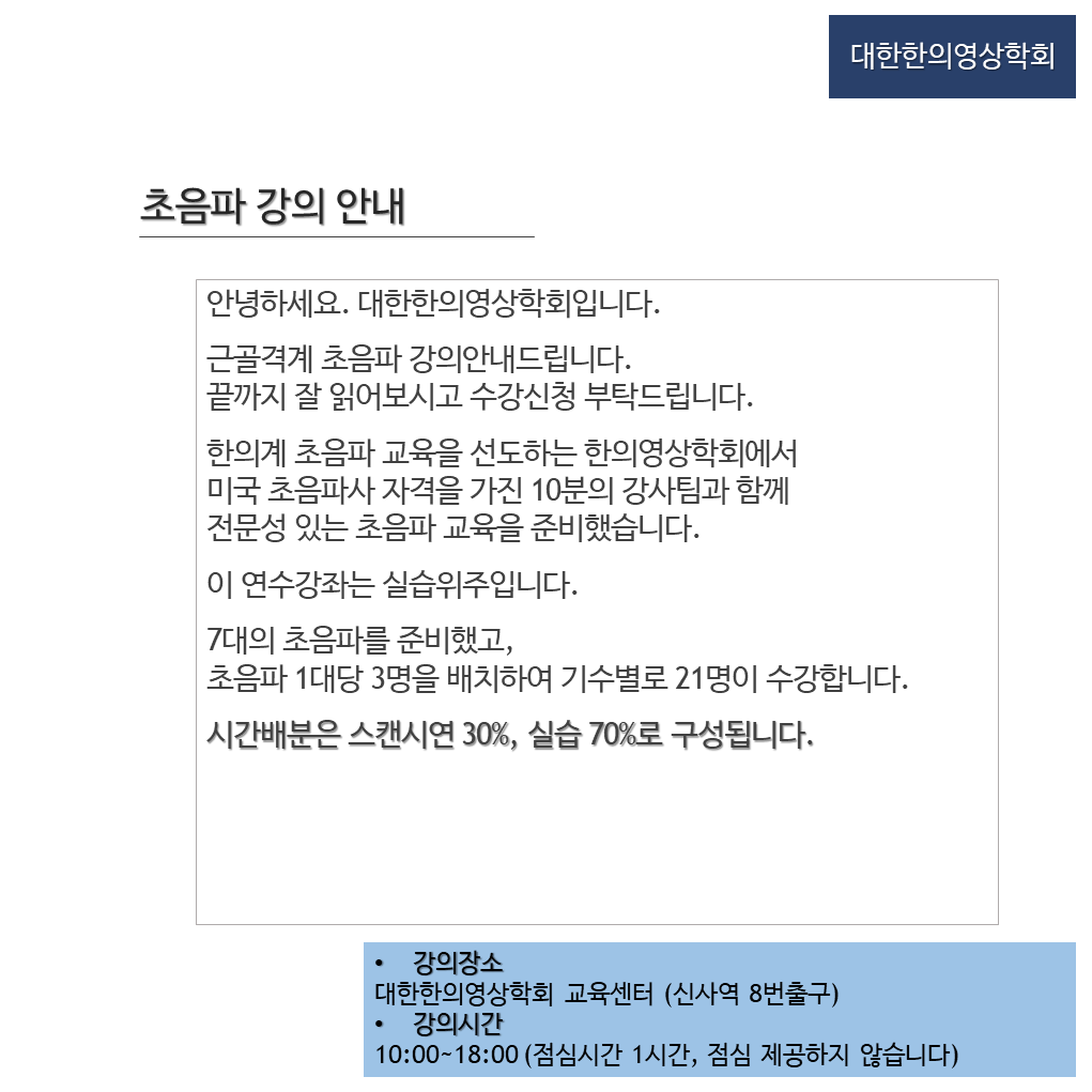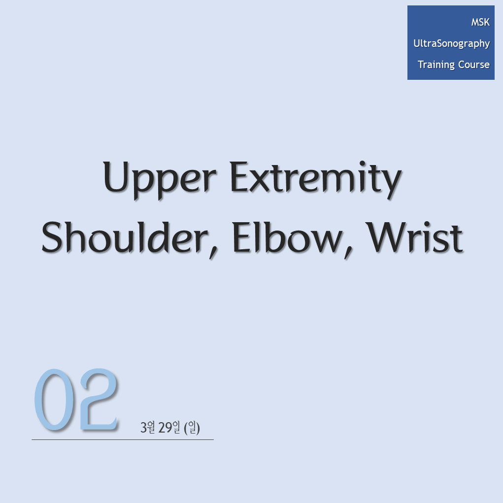 Education Seminar/Ultrasonography MSK Ultrasonography Study and Training Course / 2020 제6기 by Pharmacopuncture Research Lab 2020. 2. 4. 공유하기 게시글 관리 Acupuncture Radiology 저작자표시 비영리 변경금지 (새창열림) 관련글 Abdominal US Education Seminar Vol.09 2024 MSK Ultrasonography Study and Training Course / 2020 제7기 2019 대한한의영상학회 제5기 근골격계 초음파 임상연수강좌 2019 대한한의영상학회 제4기 근골격계 초음파 임상연수강좌
