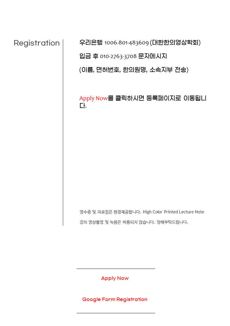 Conference/Spring Meeting KMIA Spring Meeting 2023 by Pharmacopuncture Research Lab 2023. 4. 12. 공유하기 게시글 관리 Acupuncture Radiology 저작자표시 비영리 변경금지 (새창열림) 관련글 Spring Meeting 2025 Spring Meeting 2024 2019 대한한의영상학회 춘계학술대회