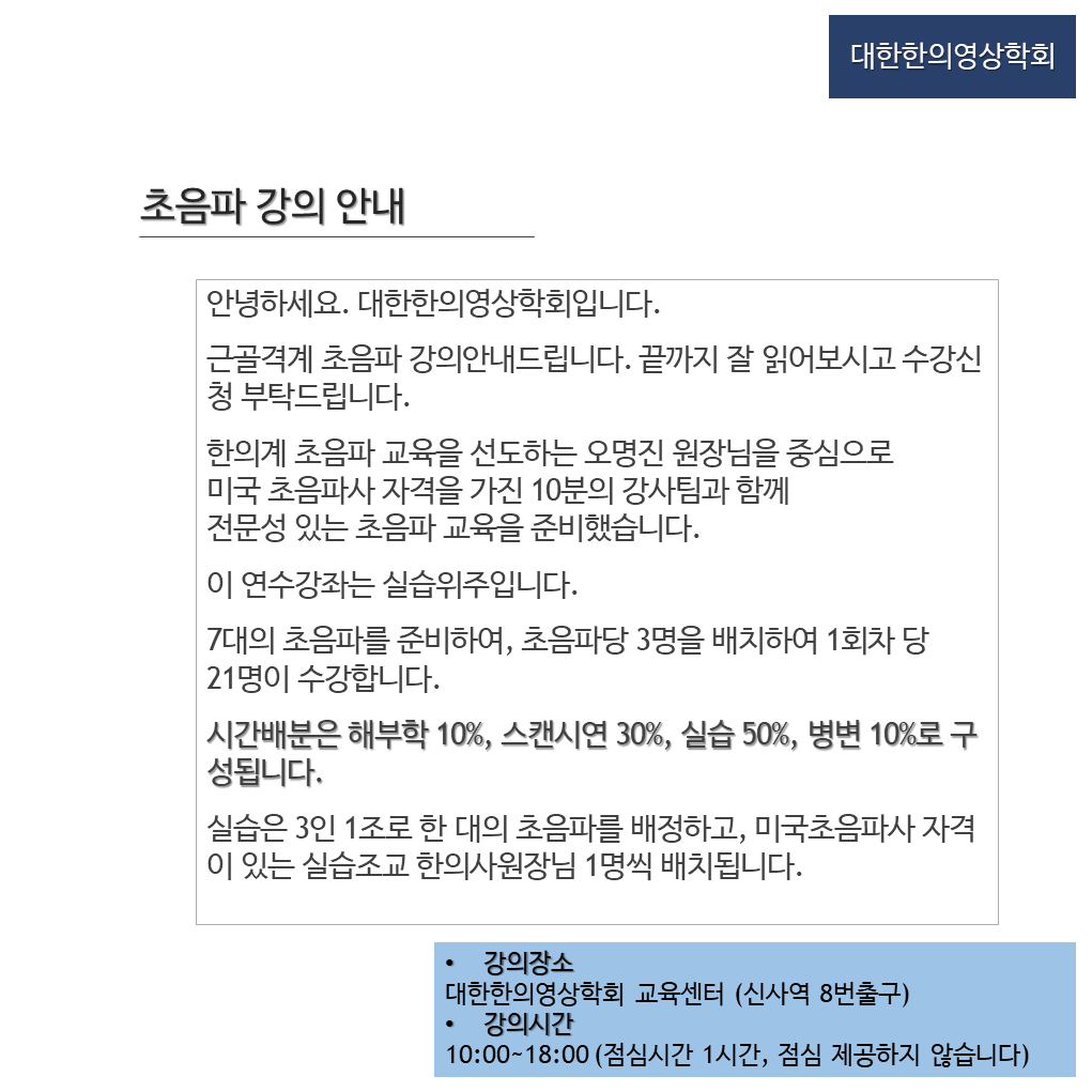 Education Seminar/Ultrasonography 2019 대한한의영상학회 제5기 근골격계 초음파 임상연수강좌 HaniRecipe 2019. 7. 30. 10:14 저작자표시 비영리 변경금지 (새창열림)
